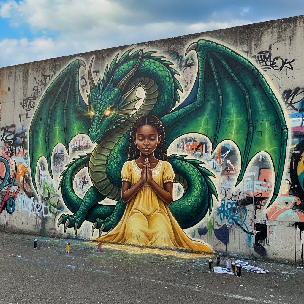 Introducing The Little Girl Against the Dragon — a piece blending biblical symbolism with my reflection on courage and faith. Inspired by Revelation, where the dragon represents the forces of evil, the little girl stands in prayer, unafraid, invoking God’s protection. Her eyes lift in trust, and a gentle light surrounds her as the Spirit shields and empowers. This artwork embodies steadfast faith, spiritual warfare, and the triumph of prayer. 3m x 6m, mixed media, @digital.